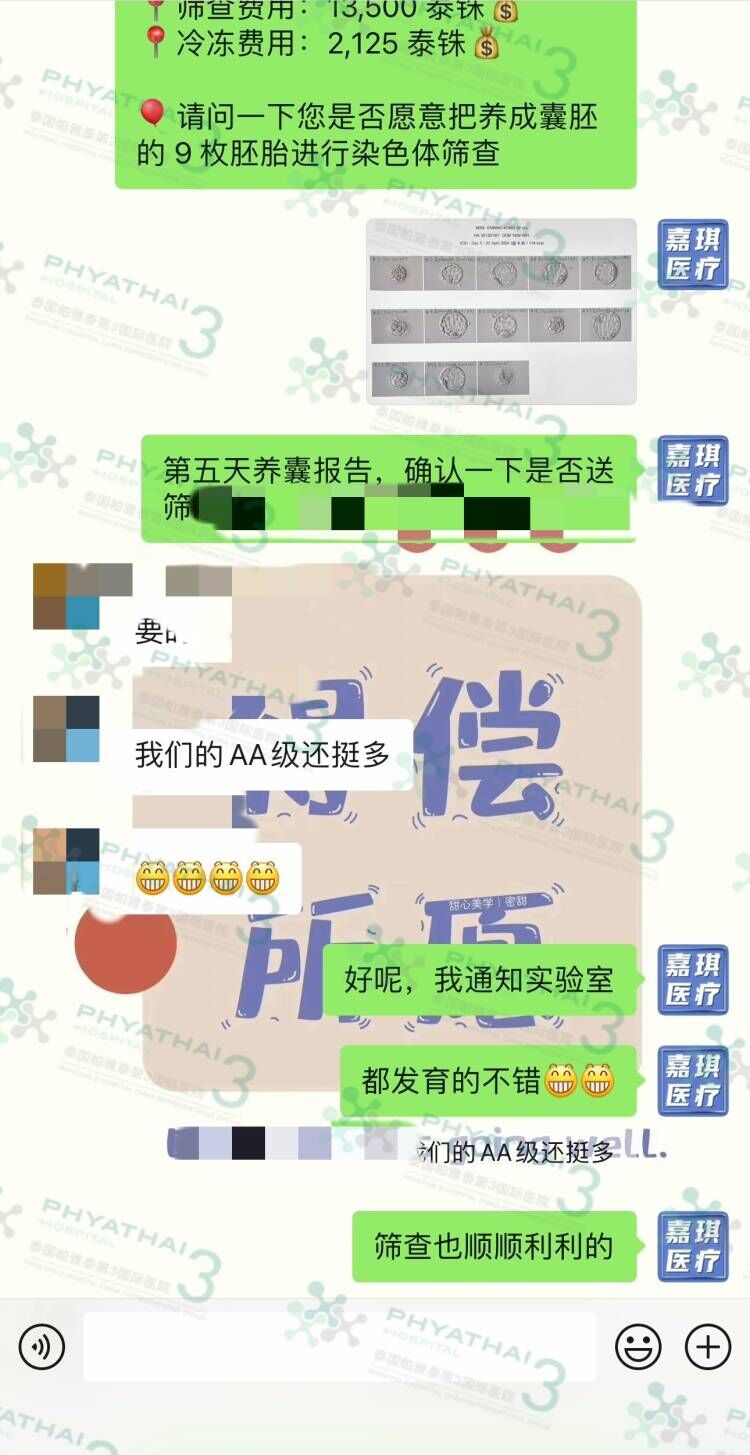 新鲜出炉的养囊报告,一大早就有好消息,这一整天都是好心情呀!第一天取卵成熟 13 受精13,受精率100%,质量也不错,今天第五天就有 9 枚成囊啦,而且还是AA级别,女士说还挺多的哈哈哈!最关键的染色体筛查来咯,又是一个漫长的7天时间,要顺顺利利的呀!女士居住在泰国曼谷,后面移植也很方便呢