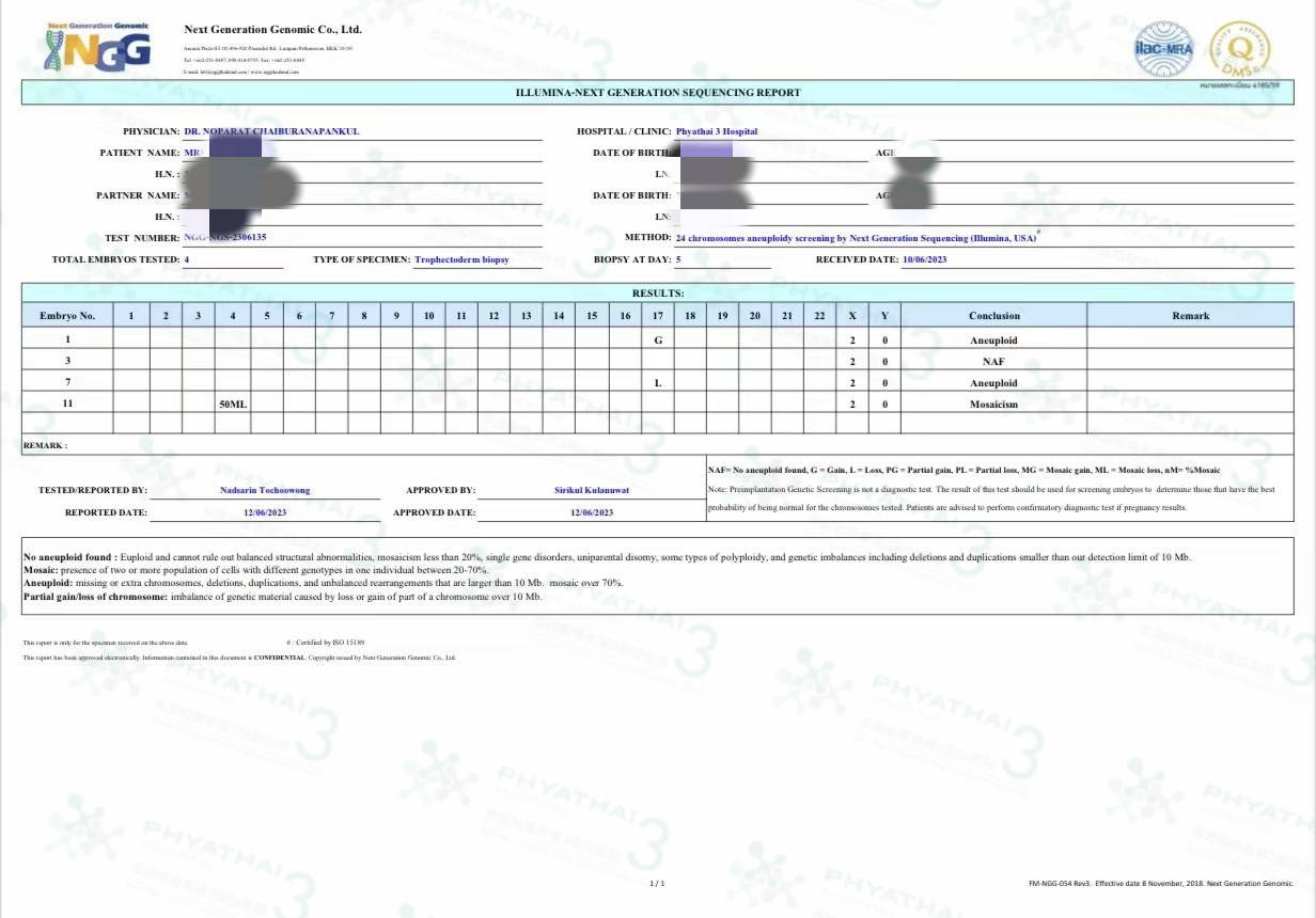 女士期待已久的小公主终于来了。卵子质量不好取卵21最终受精成功6枚,最终第五天能够有 4 枚囊胚可以送筛,简直是出乎意料,帕3实验室胚胎师太太太给力,等待了最煎熬最心惊胆战的五天后,送筛结果果然没有让人失望,送的 4 枚都是女宝,有一枚是健康可移植的,可把女士和先生高兴坏了,知道染色体结果后就立马着手准备调理好身体赴泰移植啦